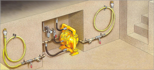 The pit installed system can be used on a continuous basis draining from more than one point at once. The diaphragm pump will handle oil of various viscosities and will tolerate being run dry for short times. Basket strainers are installed at each inlet pump so that debris can be analyses and check valves prevent drain-back.